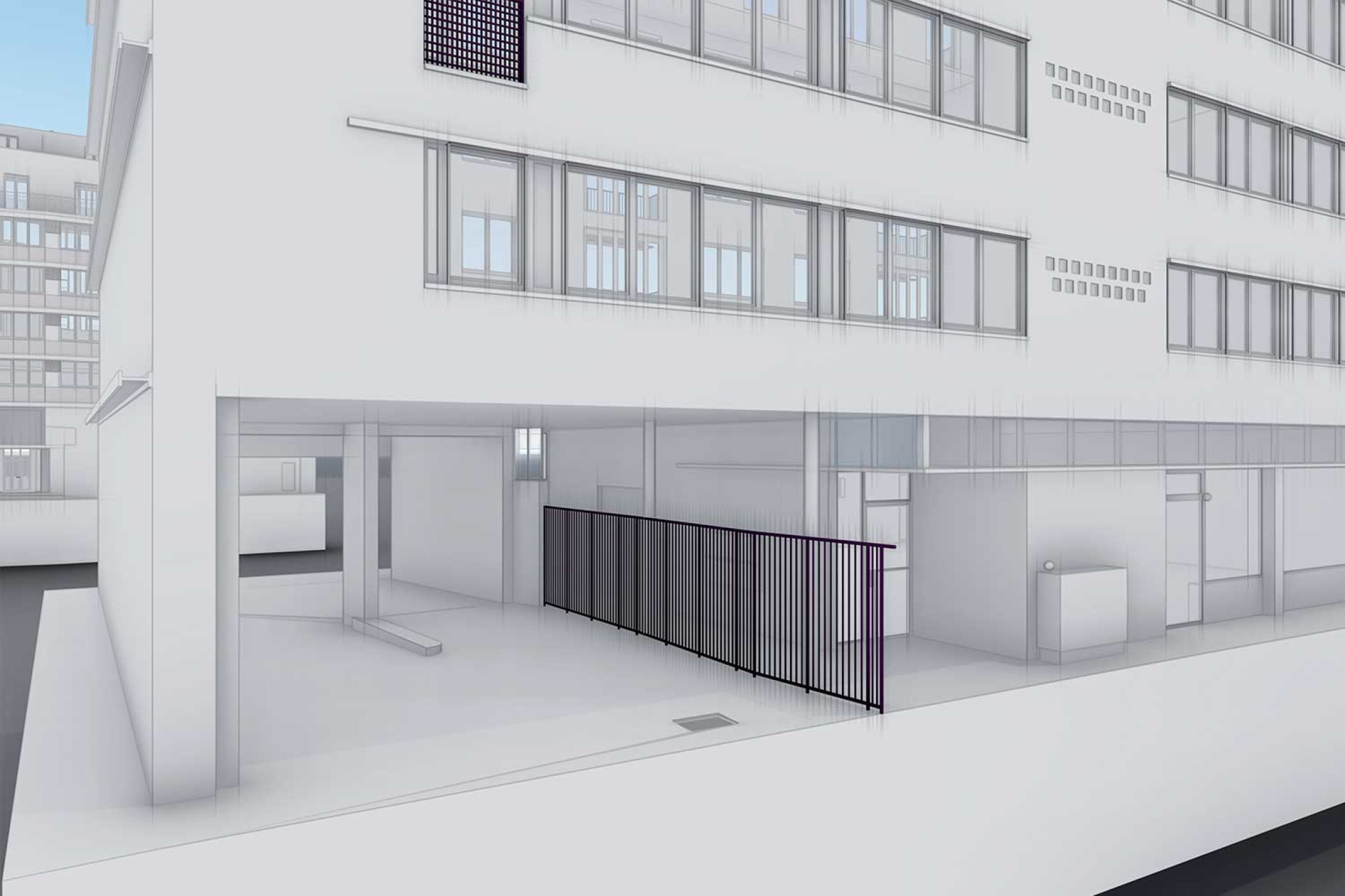 La société HMQ AG a réalisé un relevé topographique d'un immeuble résidentiel et commercial à Bâle BS à l'aide d'un scanner laser 3D. À partir du nuage de points, un modèle 3D a été modélisé dans ArchiCAD. Le relevé du bâtiment comprenait les vues de façade, la cage d'escalier et un étage type.