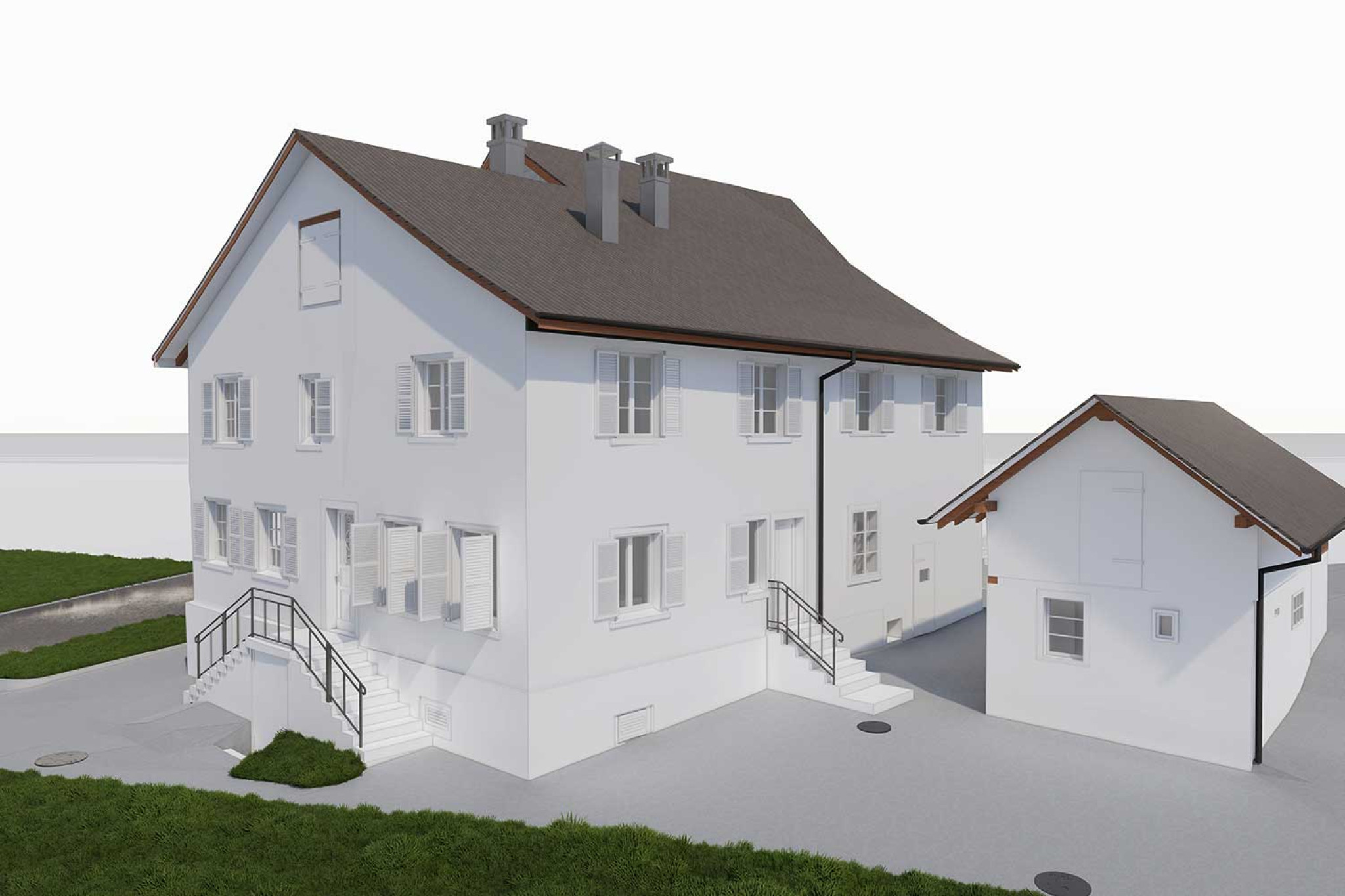 À Rudolfingen, HMQ AG a mesuré une maison d'habitation avec une grange attenante, une porcherie et un abattoir, y compris les environs. Des scanners laser 3D ont été utilisés pour le relevé complet du bâtiment. Le modèle 3D créé correspond au niveau de détail (LOD) 1:50 et comprend à la fois les zones intérieures et extérieures. La représentation détaillée de toutes les structures visibles permet une reproduction fidèle de l'ensemble du site. Outre la saisie précise des structures du bâtiment, les conditions topographiques de l'environnement ont également été intégrées dans le modèle. Cette base de données complète aide les architectes et les planificateurs dans l'analyse et la planification de futurs projets de construction. Les données du projet ont été fournies à la fois sous forme de fichier ArchiCAD et au format IFC afin de garantir une utilisation polyvalente.