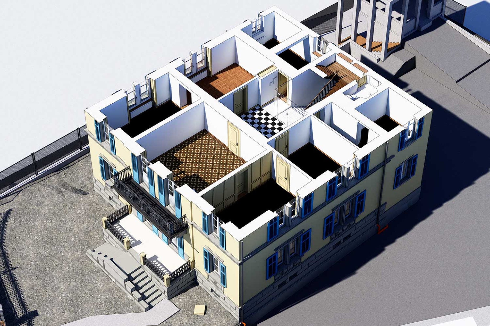À Coire, HMQ AG a réalisé un relevé du bâtiment de la Villa Brügger à l'aide d'un scanner laser 3D. HMQ AG a ensuite créé un modèle 3D compatible BIM dans ArchiCAD avec un niveau de détail LOD 1:20. Le modèle 3D reproduit intégralement le bâtiment de la Villa Brügger, y compris le parking souterrain, et représente de manière différenciée les géométries pertinentes de l'existant ; en complément, les surfaces au sol ont été dotées de textures. En plus de la modélisation 3D, une documentation photographique Matterport a été fournie, qui complète visuellement la situation spatiale de l'existant.