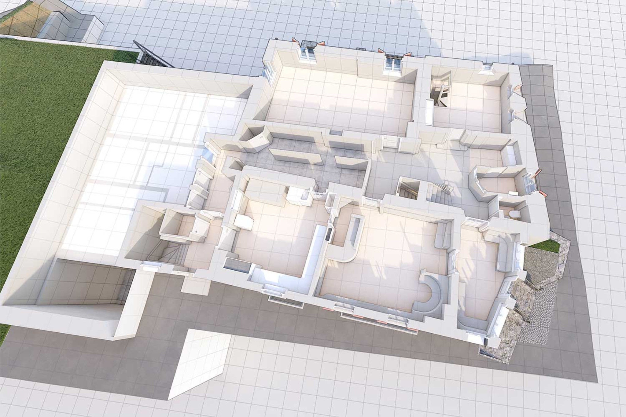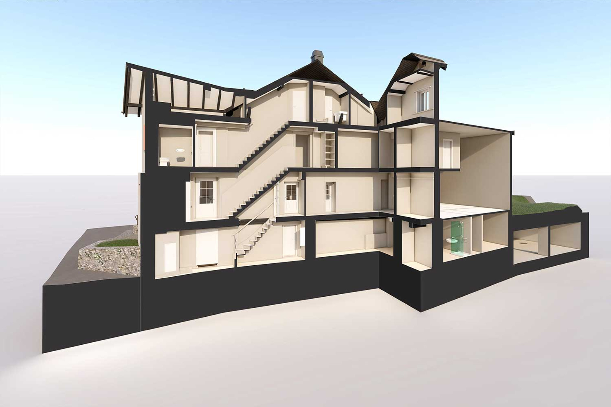 La société HMQ AG a réalisé un relevé topographique de l'hôtel pension « Hauser » à Pontresina GR, en Engadine, à l'aide d'un scanner laser 3D. À partir du nuage de points, un modèle 3D géométriquement correct a été modélisé au niveau de détail LOD 1:50. La modélisation 3D a été réalisée à l'aide du logiciel de CAO ArchiCAD.